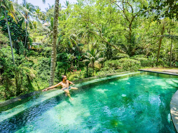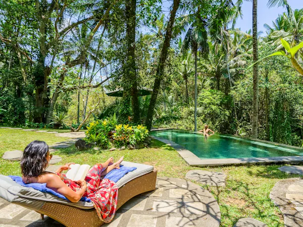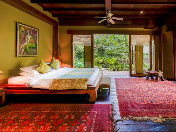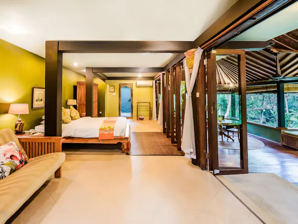 This suite features a private pool, separate living area and terrace offering spectacular views of the garden, hills, river and pool.