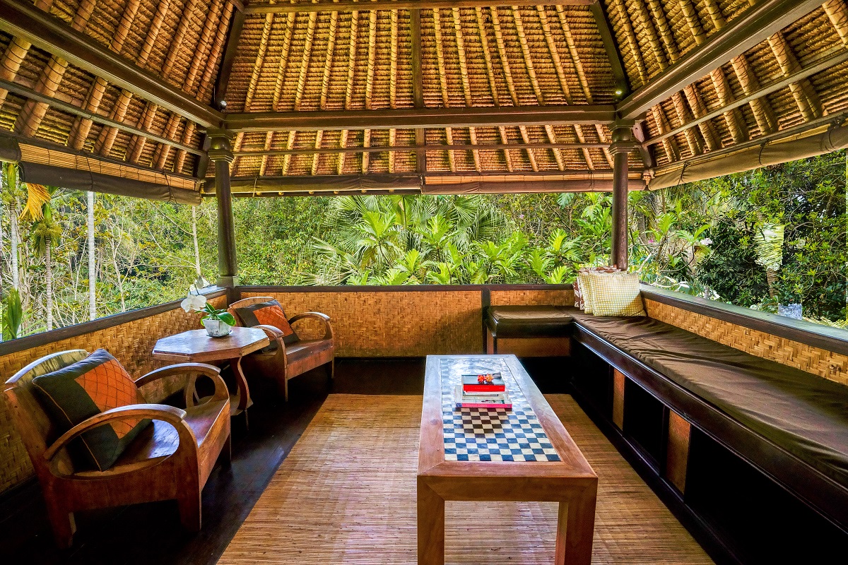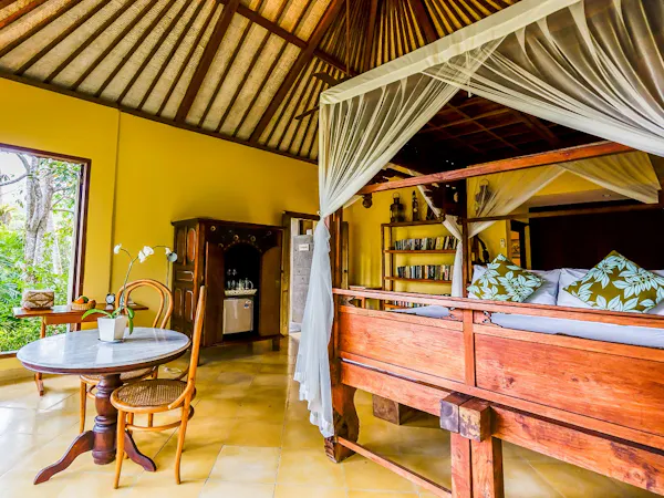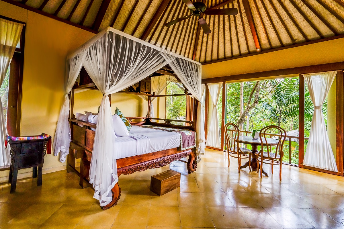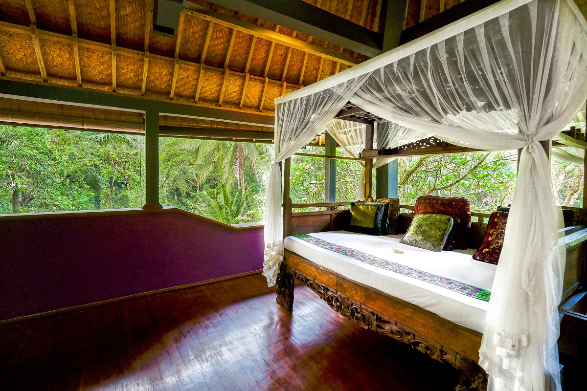 BIMA is a traditional Balinese house on 2 floors. Upstairs the bedroom and living. There are no walls and is only closed with bamboo curtains in the evening. Downstairs is a beautiful bathroom and sitting area. Both floors with spectacular views of the garden and hills.