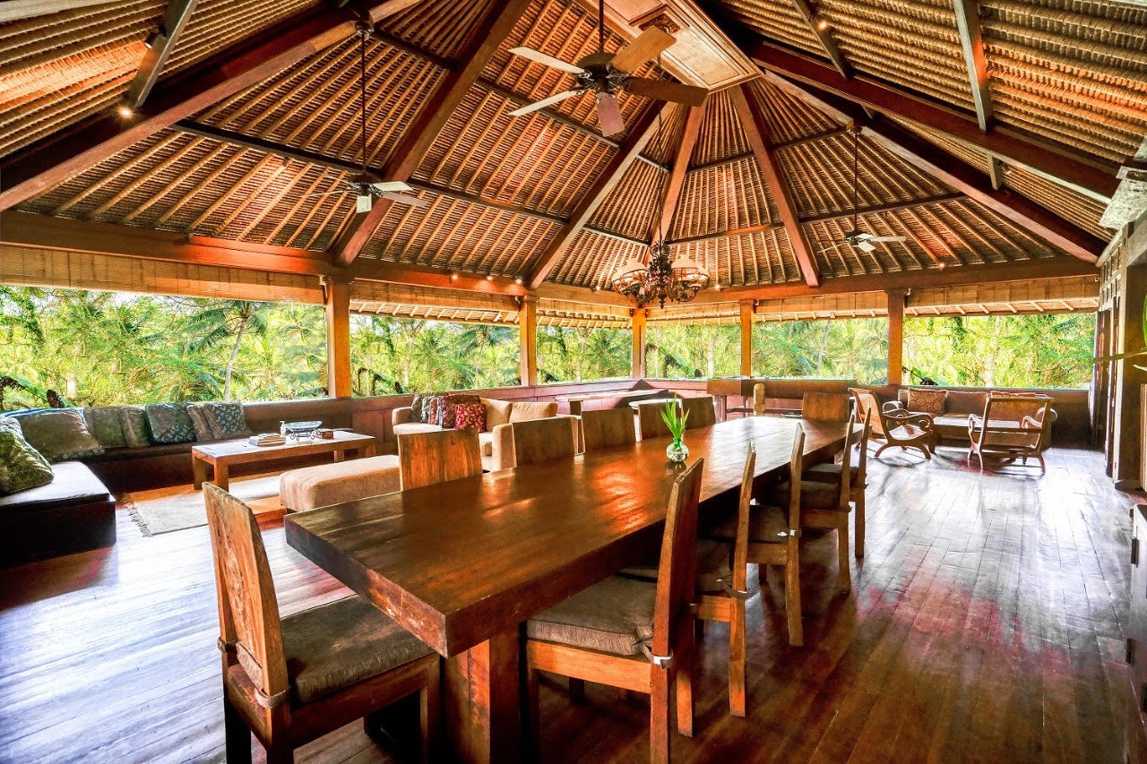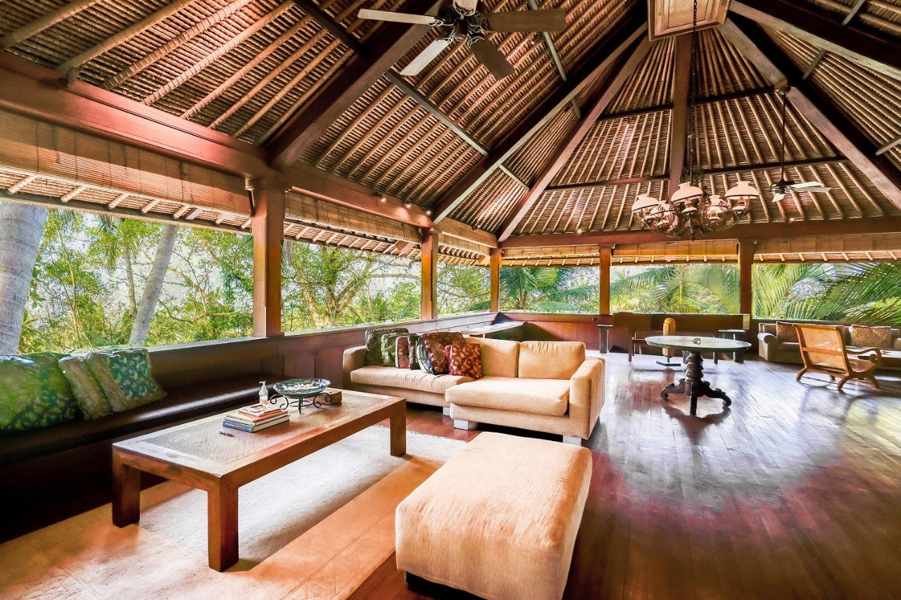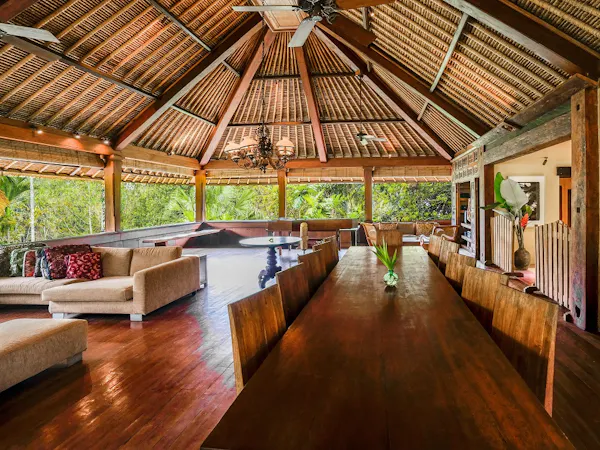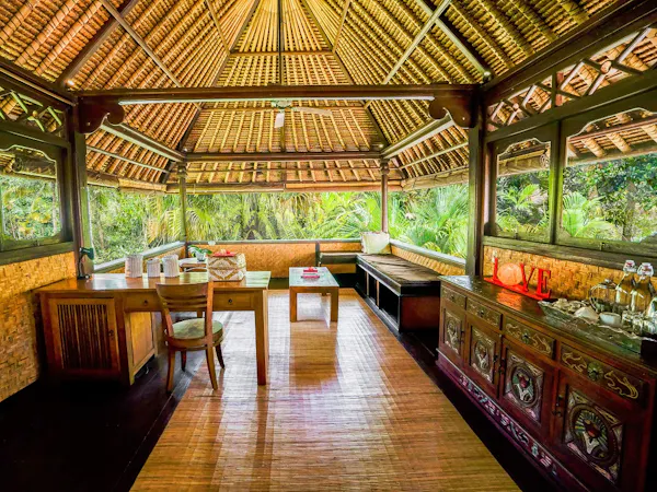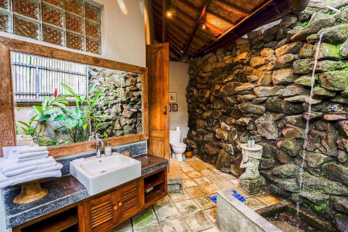 BIMA is a traditional Balinese house on 2 floors. Upstairs the bedroom and living. There are no walls and is only closed with bamboo curtains in the evening. Downstairs is a beautiful bathroom and sitting area. Both floors with spectacular views of the garden and hills.