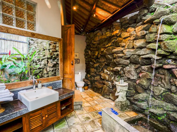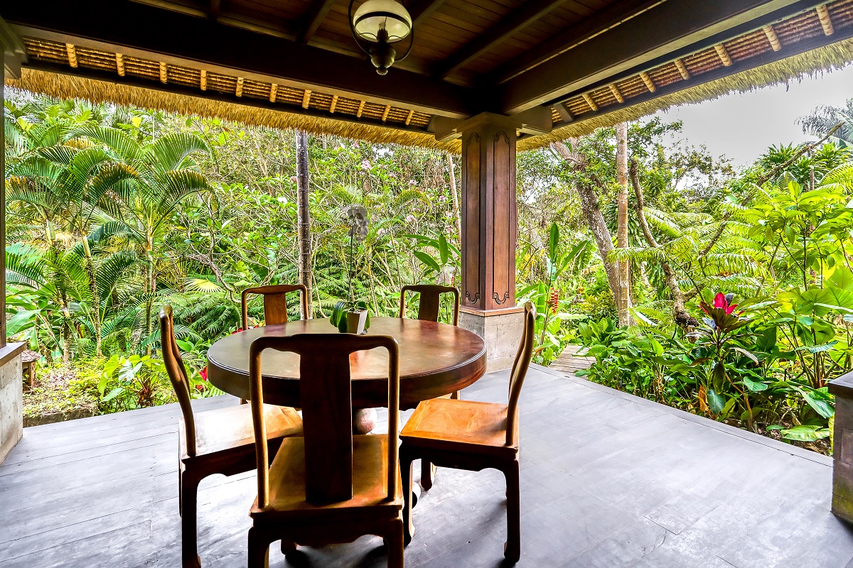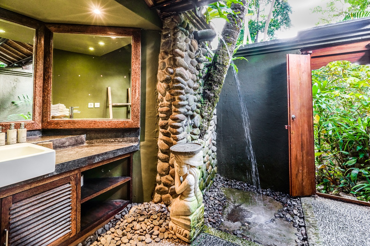 These spacious suites feature semi-outdoor bathrooms with showers and terraces overlooking the tropical gardens.