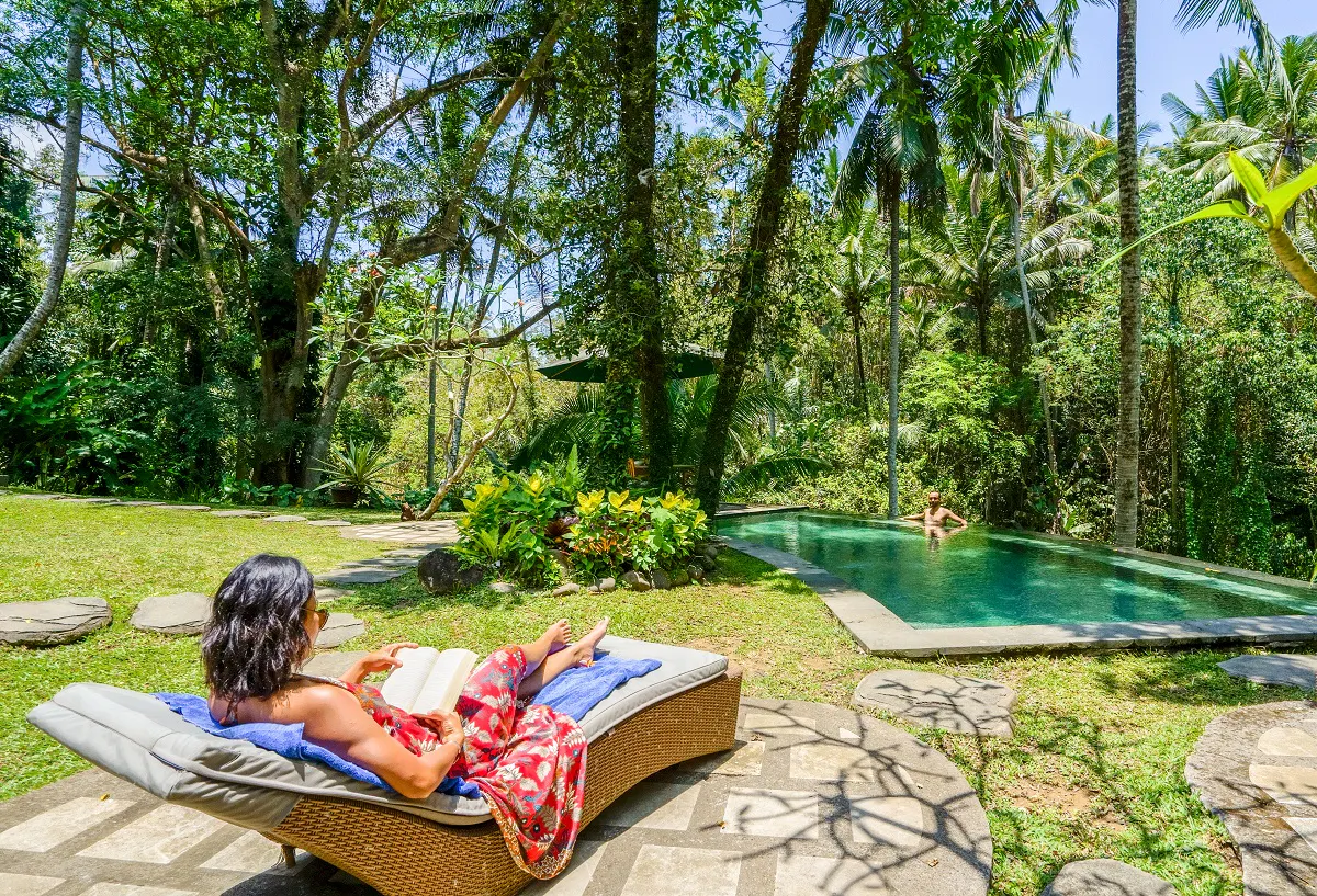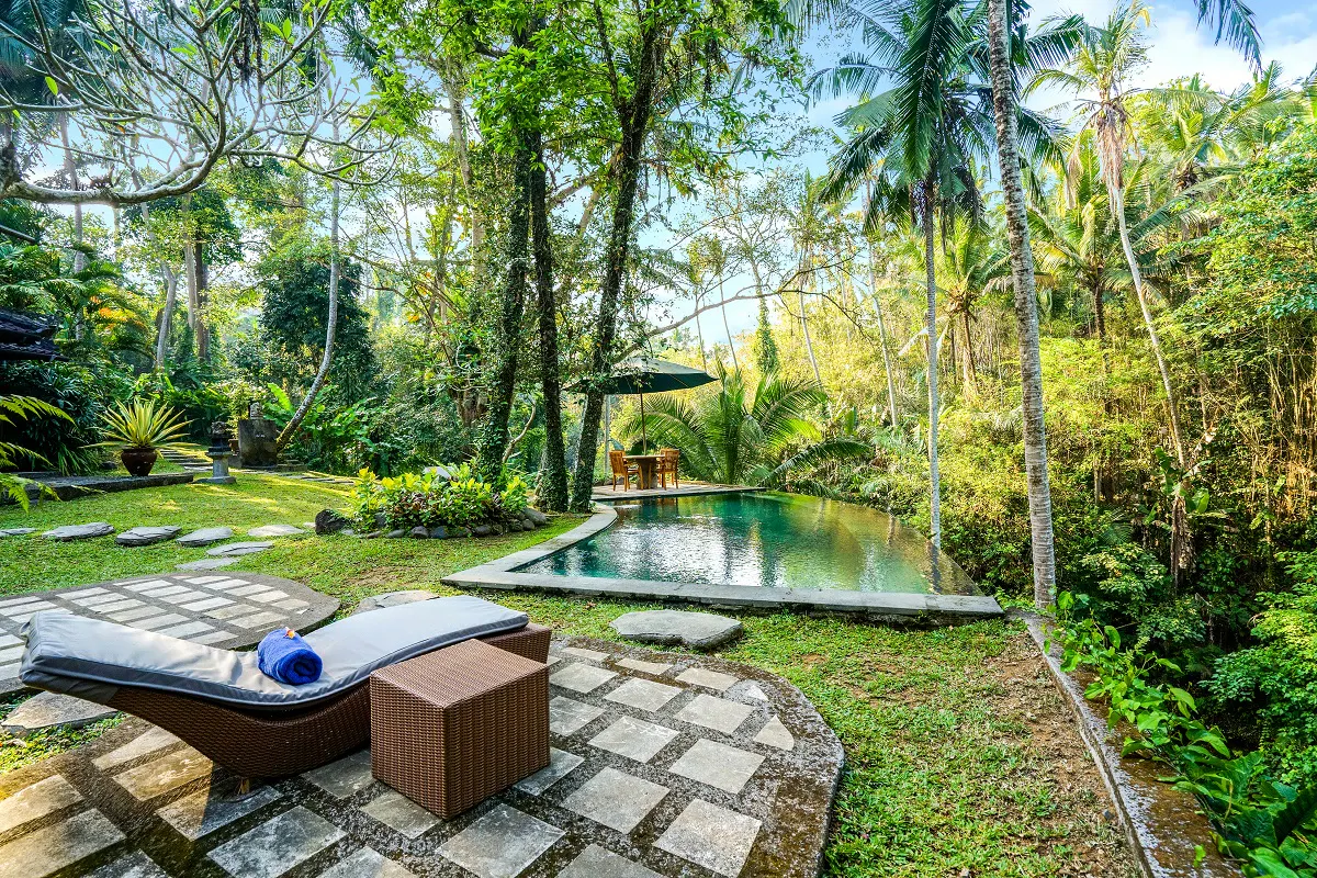 This suite features a private pool, separate living area and terrace offering spectacular views of the garden, hills, river and pool.