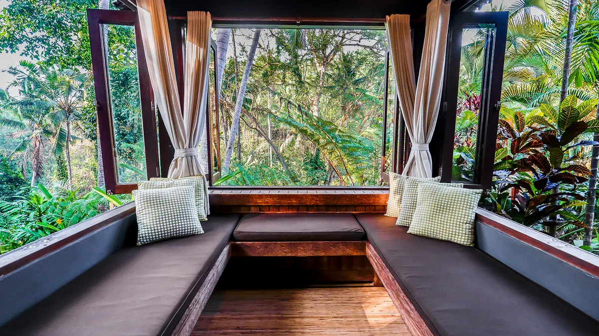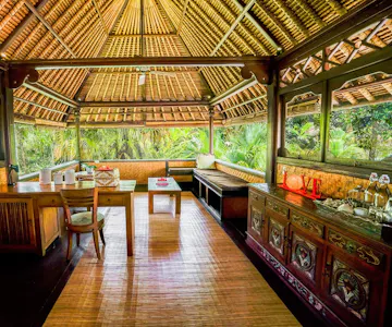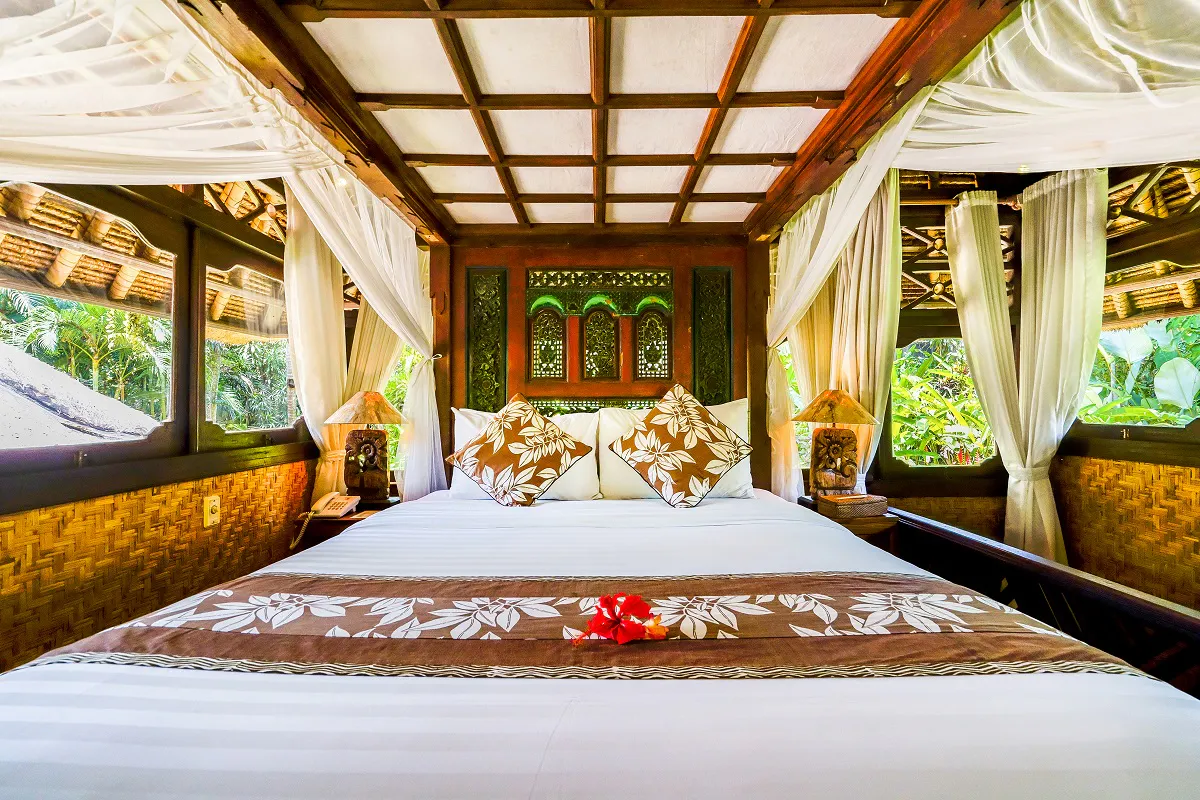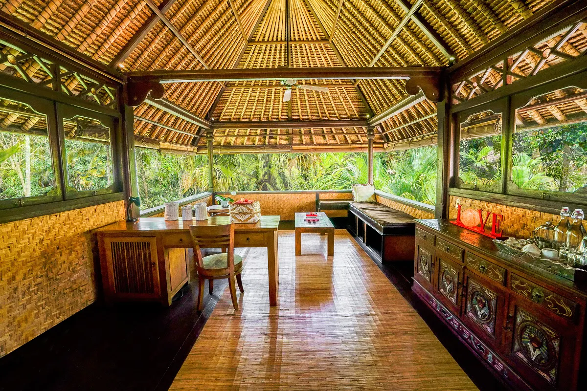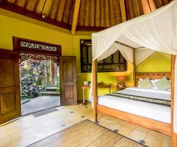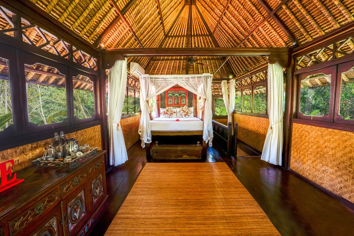 BIMA is a traditional Balinese house on 2 floors. Upstairs the bedroom and living. There are no walls and is only closed with bamboo curtains in the evening. Downstairs is a beautiful bathroom and sitting area. Both floors with spectacular views of the garden and hills.